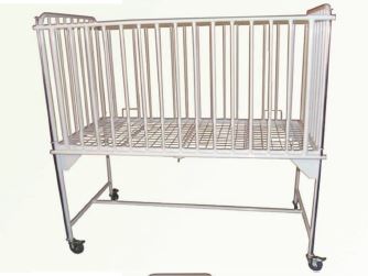 Destinato alla sistemazione ospedaliera dei bambini . Griglia in acciaio a superficie sdraiata. La recinzione protettiva ribassante poggia su quattro ruote rotanti con i freni
